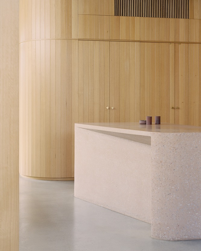 “[GoodWood] Victorian Ash was selected due to the warm and pink tones of the timber which complements the autumnal material palette throughout the project. Our studio seeks to utilise locally sourced and sustainable materials where possible and Victorian Ash, being a native hardwood species, is a great option”
