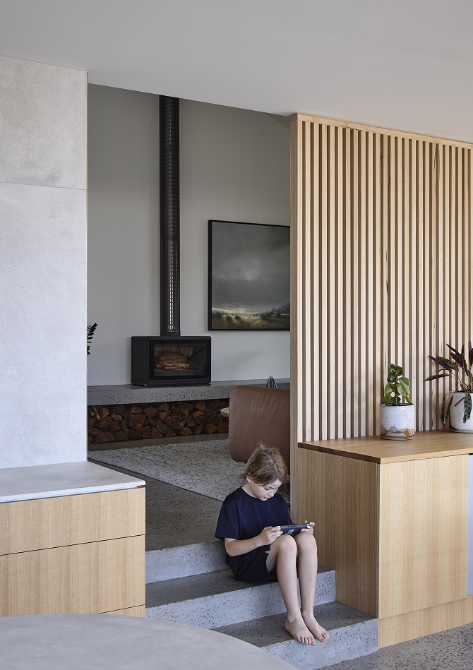 Incorporating a seamless blend between the garden and the internal living spaces, the design features robust materials like concrete flooring, benchtops and tiles, paired with GoodWood timber cabinetry and window frames, raw brass tapware and thoughtfully selected furniture and homewares that add to the overall warmth to create a beautifully inviting living space.