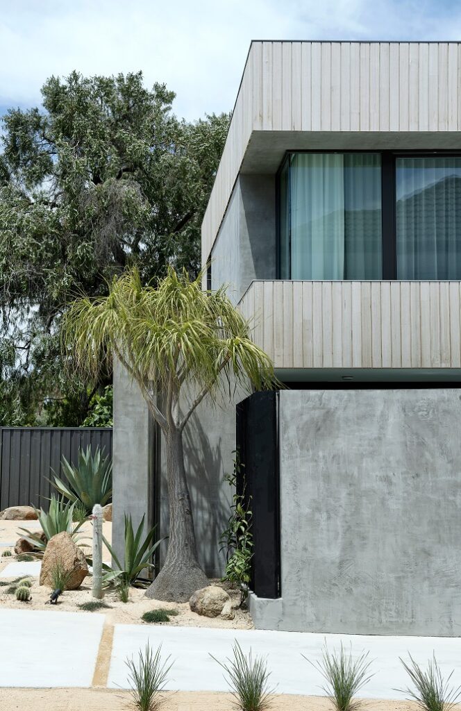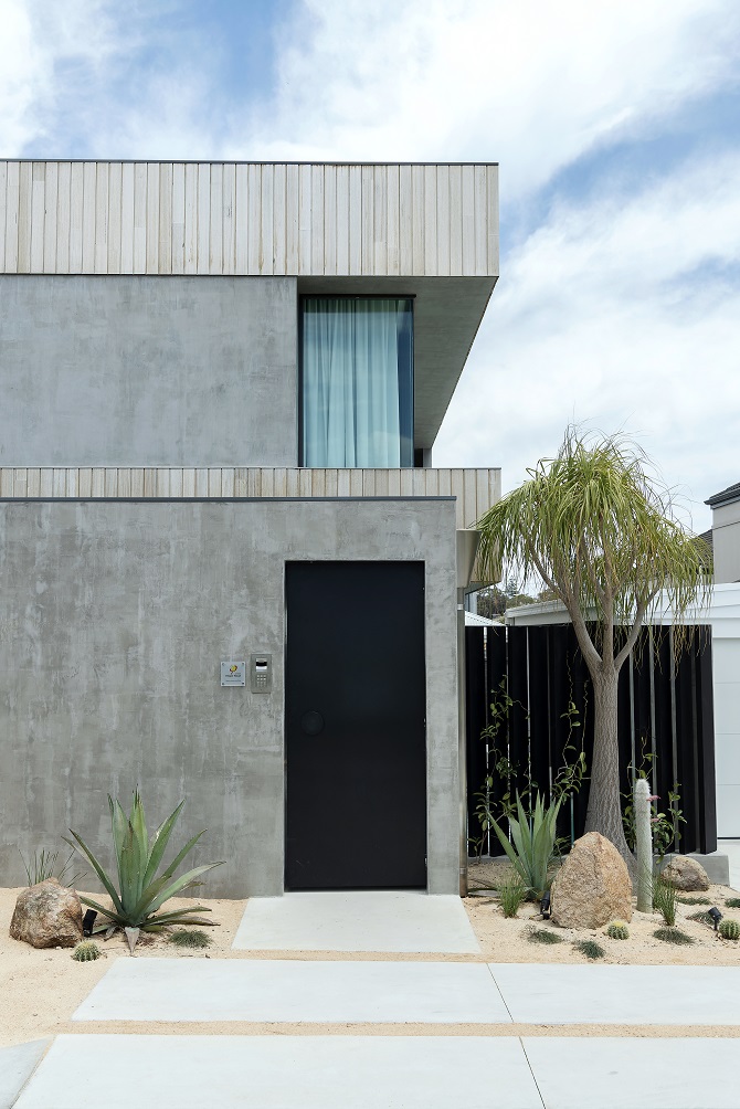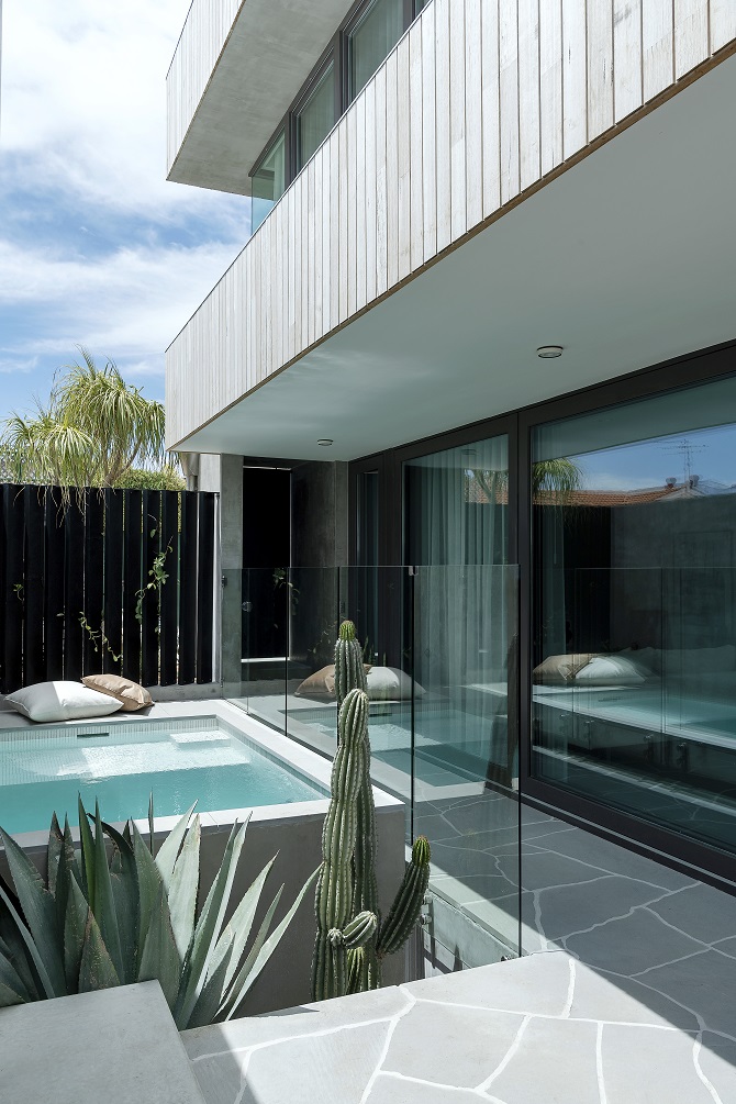The courtyard influenced by ‘desert modernist design’ features cactus and succulents to complement the minimalist nature of the home whilst adding a pop of green to contrast the blue reflections of the pool. Although located adjacent to a public laneway, the clever use of the space both inside and out means that the dwelling feels open, yet private.