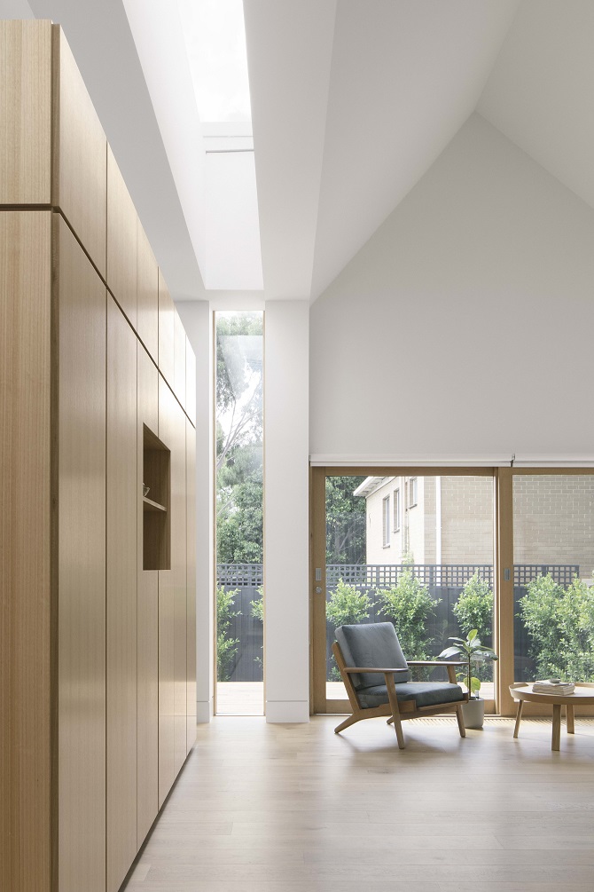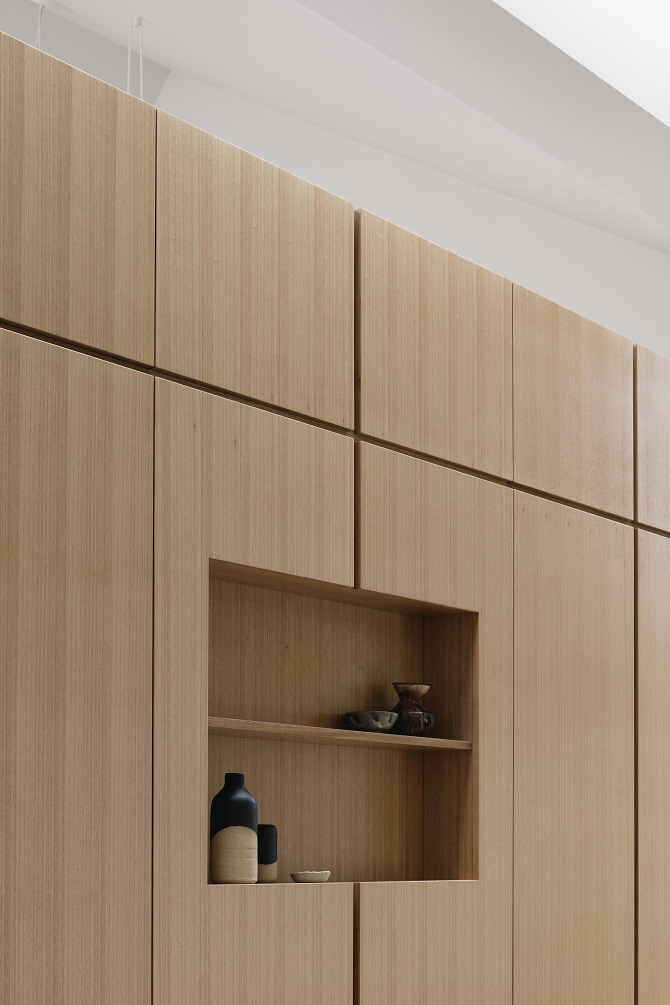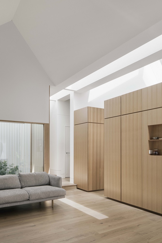 “Muted timber insertions form the interior, running across the flooring, and encasing the integrated joinery and kitchen. Natural stone and painted plaster then add a balanced and softened counter to the timber, allowing the light to amplify.”