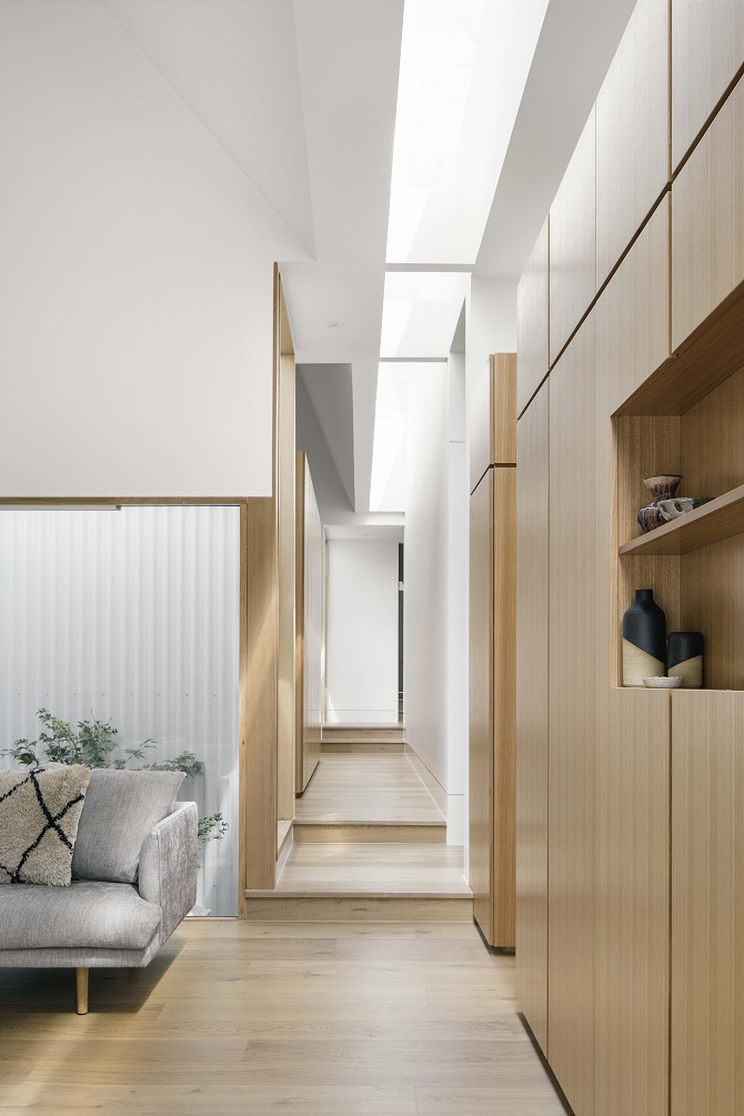 Kew Cottage combines the use of light and spatial understanding with a muted material palette consisting of crisp white walls, Spandek cladding and GoodWood Victorian ash timber for added softness and warmth. The modernised heritage home integrates its existing charm and character with contemporary finishes for a harmonious balance between old and new.