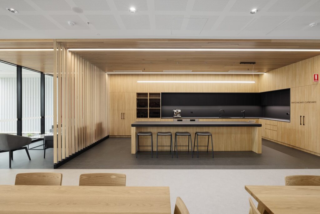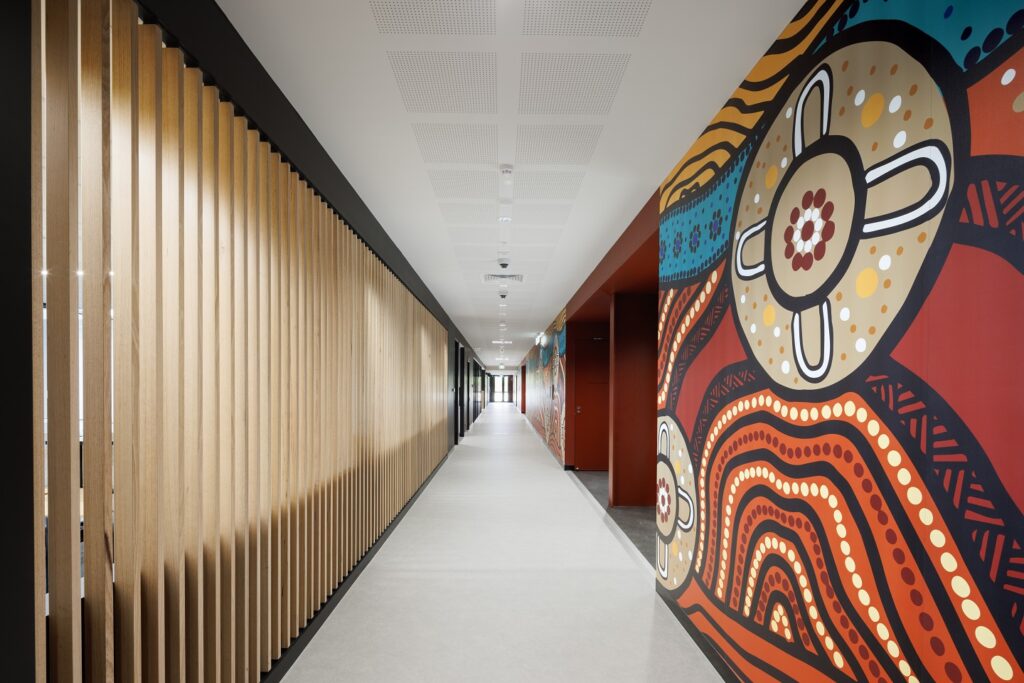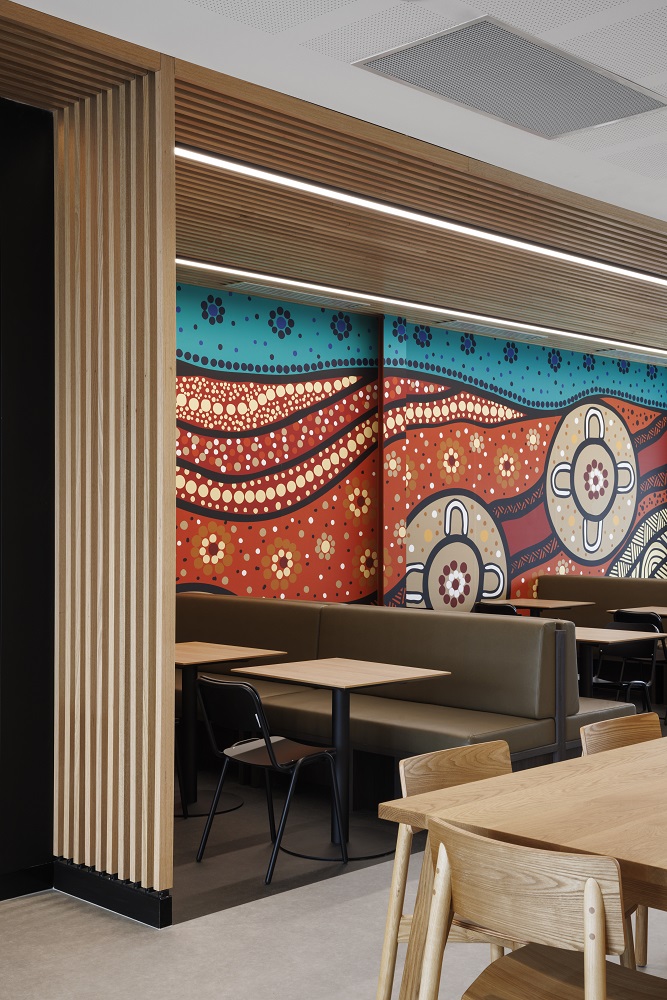 Alongside the blonde timber, is a rich and warm art instalment by Billy-Jay O’Toole, a Wadawurrung man whose artwork was developed as a 44m graphic and applied to the hub interior.