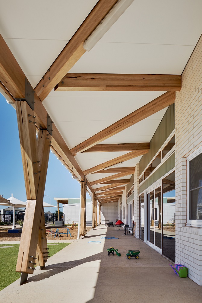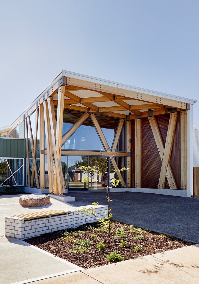 The entrance, foyer and outdoor undercover areas of the build feature unique geometric timber designs made using MASSLAM45 300 x 140, 250 x 150, 390 x 190 and 230 x 240 columns and beams. MASSLAM is our range of glue-laminated column, beams, floor and roof systems available in a variety of attractive Australian hardwoods and softwoods. Utilising mass timber offers major benefits to construction as it is cheaper than concrete and steel, faster to build with, safer due to prefabrication, more accurate, lighter in weight and fire resistant. Learn more about our MASSLAM range here.