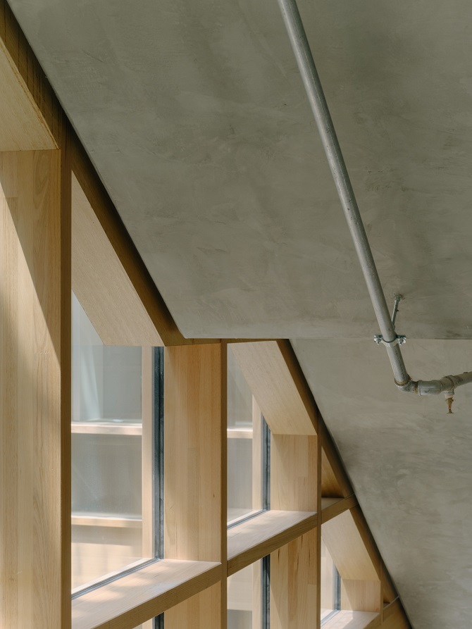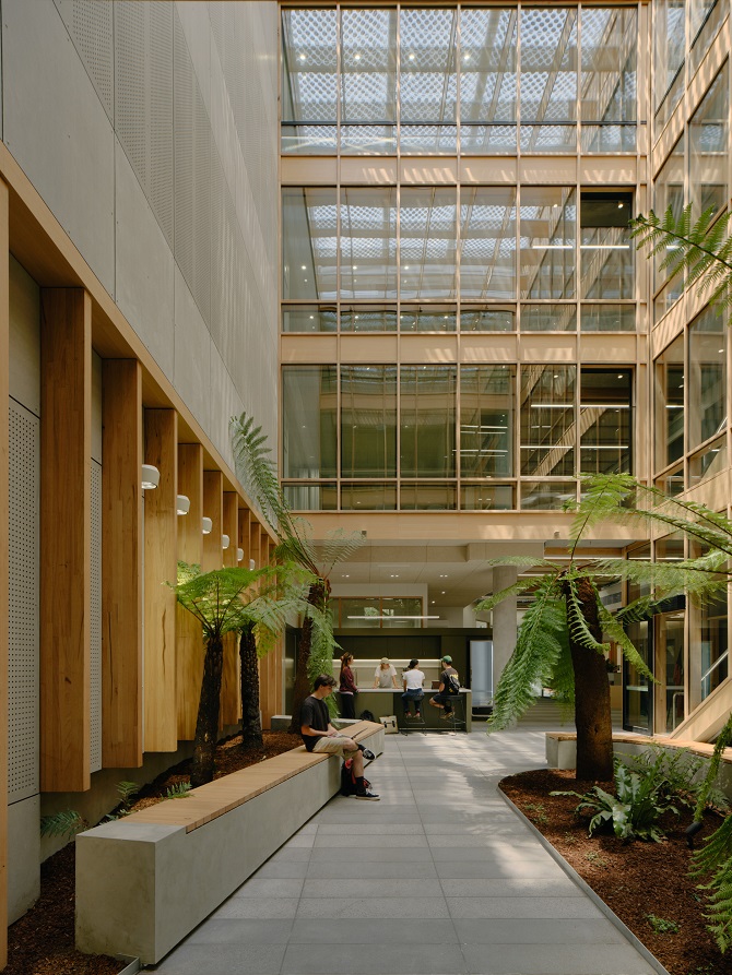 The space showcases an amalgamation of materials including reinforced concrete, precast vertical panels and MASSLAM45, ASH’s range of glue-laminated columns, beams, floor and roof systems for mass timber construction.